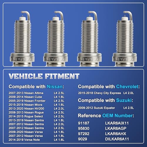 [Vehicle Fitment]: This automotive replacement spark plugs for Nissan Altima 2007 2008 2009 2010 2011 2012 2013 L4 2.5L, Nissan Frontier 2005-2019 L4 2.5L, Nissan Cube 2009-2014 L4 1.8L, Nissan Rogue 2008 2009 2010 2011 2012 2013 L4 2.5L, Nissan Rogue Select 2014 2015 L4 2.5L, Nissan Sentra 2013-2019 L4 1.8L, Sentra 2007-2012 L4 2.0L 2.5L, Nissan Versa 2009-2020 L4 1.6L, Versa 2007-2012 L4 1.8L, Nissan Versa Note 2014-2019 L4 1.6L, Nissan NV200 2013-2020 L4 2.0L–Gap 0.044″