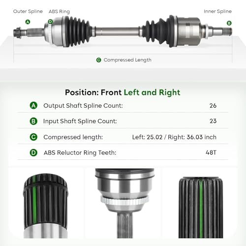 [Specifications]: ① Location: Front Left and Right CV axle shaft (Driving force and Passenger Side); ② ABS Shaft Spline Count: 48T; ③ Axle Nut Included: Yes; ④ Compressed Length: 25.02(Left) 36.03(Right) ; ⑤ Outboard Spline Quantity:26; ⑥ Inner Spline Quantity: 233