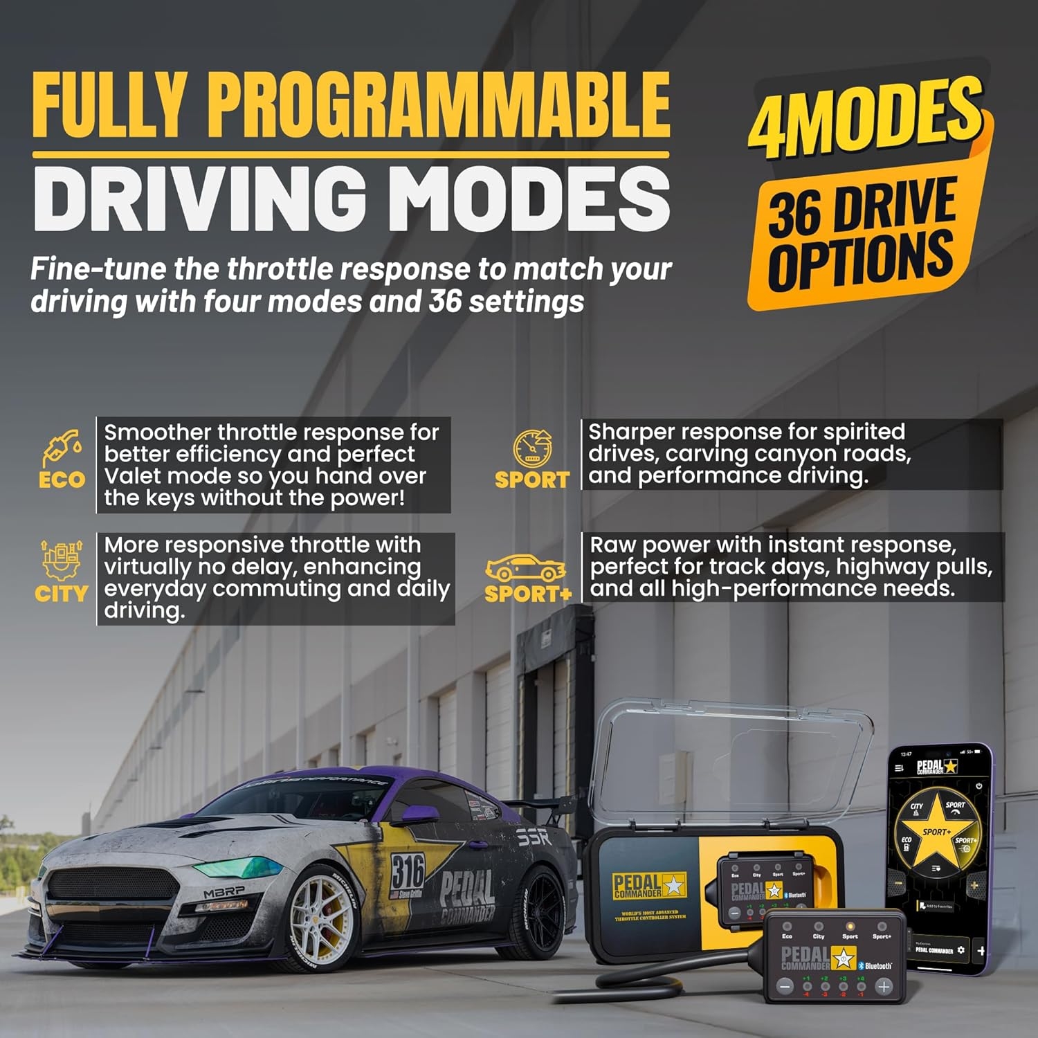 • 36 CUSTOM SETTINGS: Choose from 4 driving modes (Eco, City, Sport, and Sport+) with 9 sensitivity levels each. That’s 36 ways to customize your Mustang’s throttle response, letting you dial in smoother commuting, aggressive street driving, or high-performance bursts.