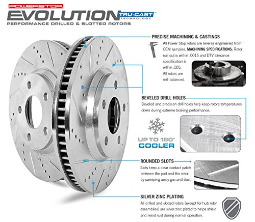 Power Stop drilled and slotted rotors give you the advantages of both drilled holes for cooling and slots to sweep away gas and dust. Power Stop rotors use only the finest blanks and feature G3000 grade castings from the best foundries. All drilled and slotted rotors (except for hub rotor assemblies) are silver zinc plated to resist rust. The drilled and slotted design is their most popular performance rotor for street and day track applications.