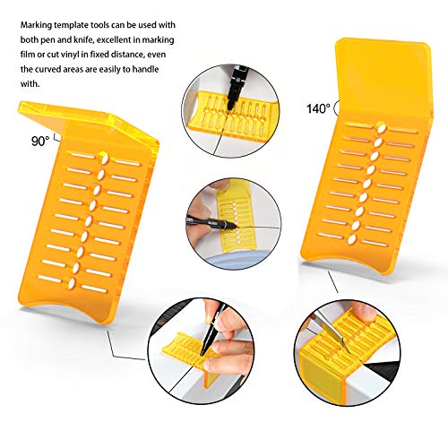 2pcs yellow sliding mark scrapers with different angles,can be utilized to make mark all the way through cutting extra vinyl, also can cut the vinyl film into specific width, Calibration of the board is clear enough to measure whilst marking.