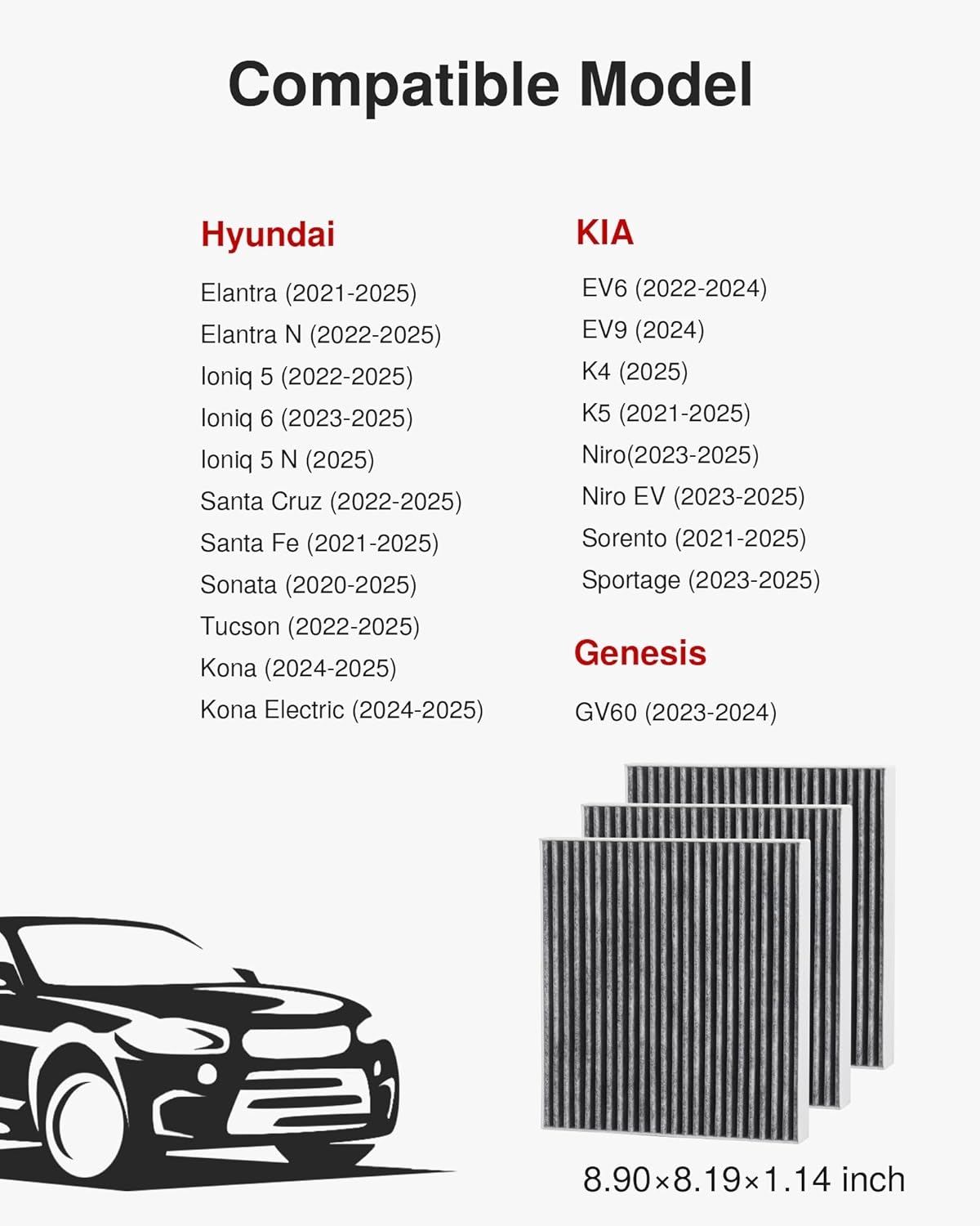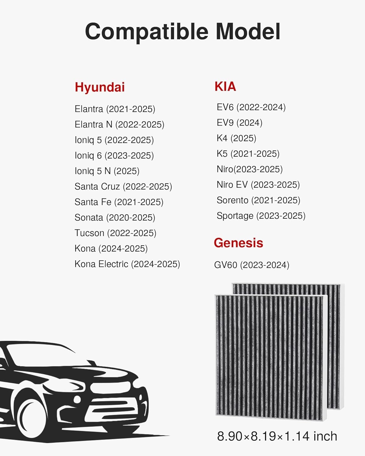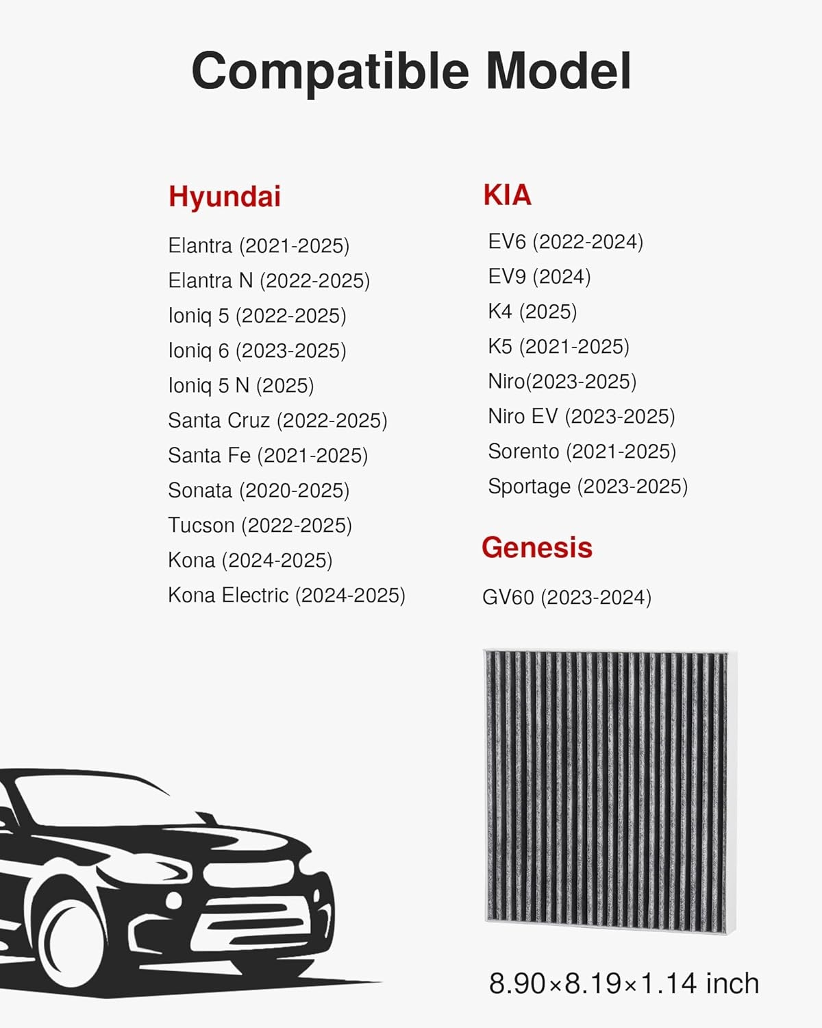 • Compatible Replacement: Our cabin air filter is compatible with Hyundai: Elantra (2021-2025), Elantra N (2022-2025), Ioniq 5 (2022-2025), Ioniq 5 N (2025), Ioniq 6 (2023-2025), Kona (2024-2025), Kona Electric (2024-2025), Santa Cruz (2022-2025), Santa Fe (2021-2025), Sonata (2020-2025), Tucson (2022-2025). KIA: EV6 (2022-2024), EV9 (2024), K4 (2025), K5 (2021-2025), Niro(2023-2025), Niro EV (2023-2025), Sorento (2021-2025), Sportage (2023-2025). Genesis: GV60 (2023-2024). Replacement for FRAM: CF12820, Hyundai: 97133-N9100, Hyundai: 97133-L1000, Hyundai: 97133-L0000, Premium Guard: PC99554P, LUBER-FINER: CAF10079P.