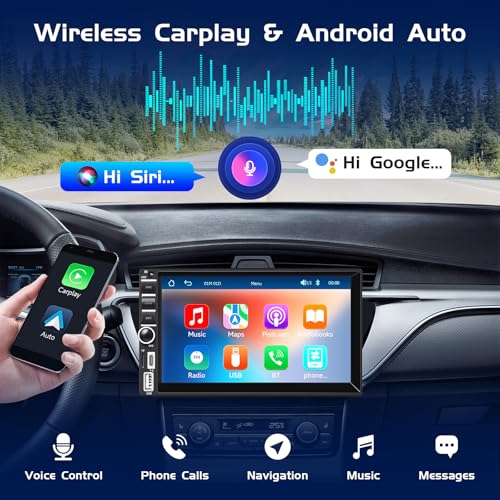 🚗【Wireless CarPlay and Android Auto】 Our double din car stereo connects your phone to the car without needing a USB cable. It features the latest voice control technology, allowing you to make calls, navigate, and play music using your smart voice assistant while driving safely.