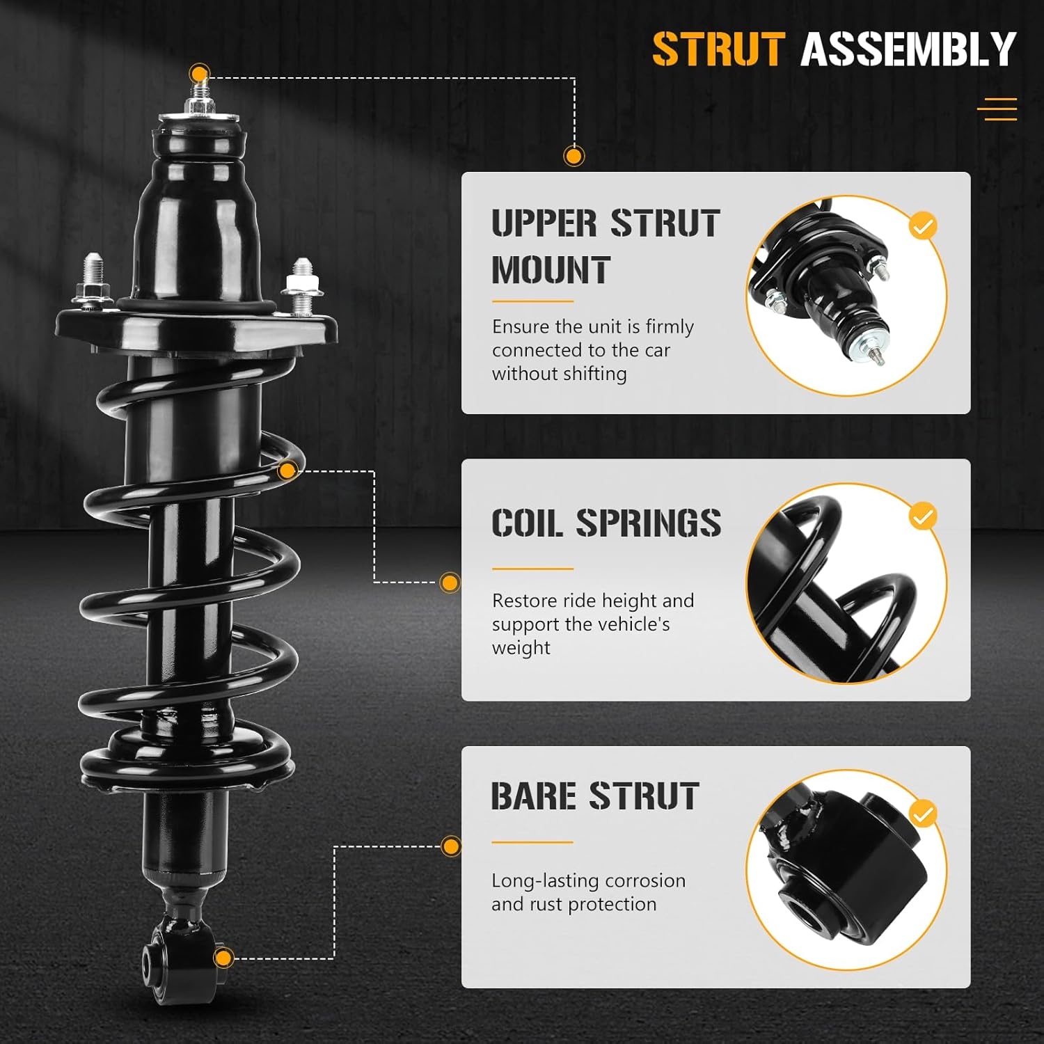 Worn rear struts reduce braking stability and vehicle control—especially in emergency maneuvers. Replacing complete assemblies restores predictable handling and keeps the rear tires planted.