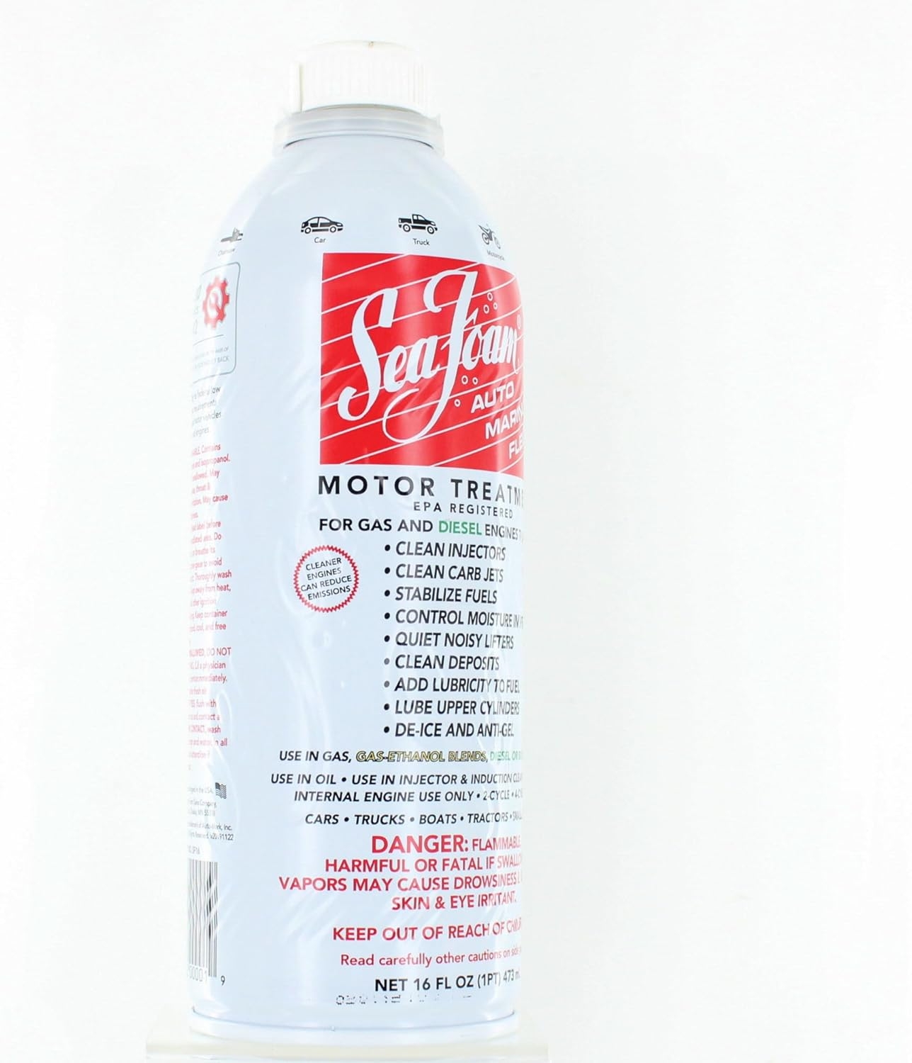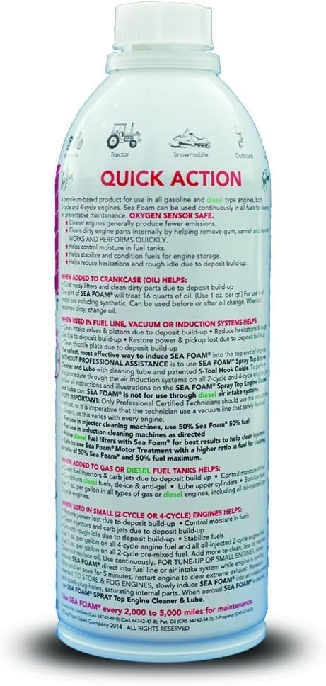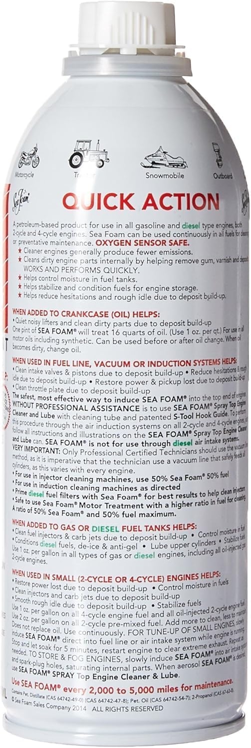 Help your engine run smoother and last longer! Sea Foam works in fuel and oil systems to clean and lubricate critical engine areas. Made from petroleum ingredients, Sea Foam is safe and effective when used in any gasoline or diesel engine. Just pour it in!