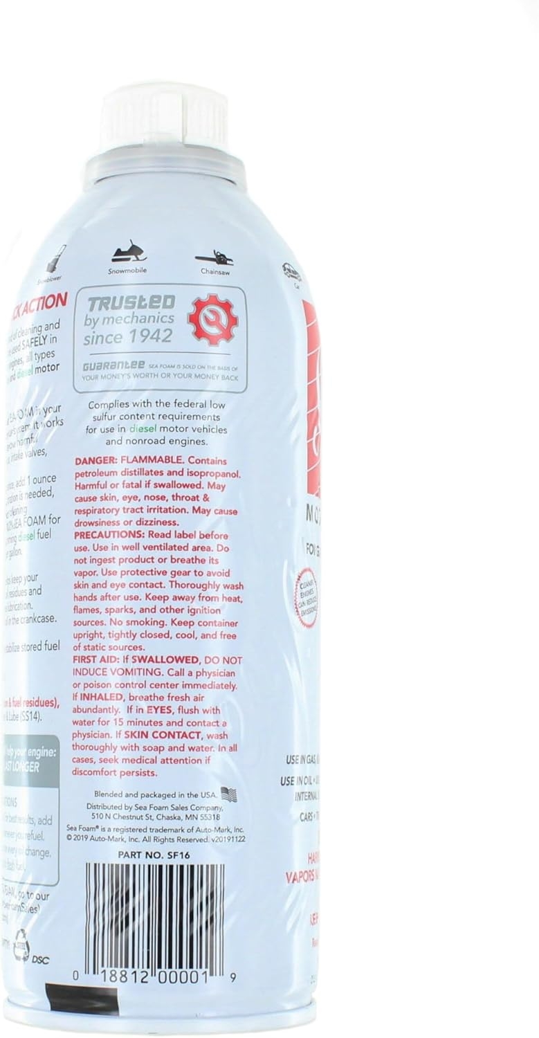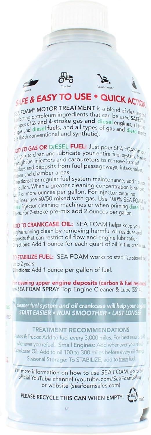The Sea Foam SF-16 Motor Treatment is an outstanding product that truly delivers on its promises. After using it in multiple applications for my vehicles, I’m convinced this is a must-have for anyone looking to maintain and enhance engine performance. The 4-pack is an excellent value and ensures I always have some on hand for routine maintenance.Why Sea Foam Stands OutMulti-Use Versatility: This product is a game-changer! I’ve used it as a fuel additive, an oil treatment, and even to clean out stubborn deposits in my carburetor. It works flawlessly across applications, making it an all-in-one solution for keeping engines running smoothly.Improved Performance: After adding Sea Foam to my fuel tank, I noticed a significant improvement in my vehicle’s fuel efficiency and a smoother idle. It’s particularly effective at removing deposits and buildup that can reduce performance over time.Easy to Use: The instructions are straightforward, whether you’re using it for fuel, oil, or cleaning purposes. The precise measuring cap ensures no mess or guesswork, making it simple to get the correct dosage every time.Great for Long-Term Maintenance: Regular use of Sea Foam has made a noticeable difference in prolonging the life of my engine. I’ve also used it to revive an older lawnmower engine, which now runs like new! This product pays for itself by preventing costly repairs.Packaging and ValueThe 4-pack is perfect for multi-vehicle households or anyone maintaining more than just a car. I’ve used it in my truck, car, and small engines like my generator and lawn equipment, and I still have plenty left.Pro TipsAdd Sea Foam to your fuel before a long drive to maximize its cleaning effect.Use it regularly in oil changes to keep sludge buildup at bay.It’s also great for seasonal storage—just add it to your gas tank to stabilize fuel and protect the engine.Final ThoughtsSea Foam SF-16 is the real deal for anyone who values vehicle performance and longevity. Its multi-use functionality, ease of application, and proven results make it a standout product. I’ve already seen noticeable improvements in my vehicles and equipment, and I’ll continue to use it as a staple in my maintenance routine. Highly recommend it to anyone who takes pride in keeping their engines in top shape!Pro Tip: Whether you’re a DIY mechanic or just looking for a reliable maintenance product, Sea Foam is a must-have. It’s one of the simplest and most effective ways to protect your investment and extend the life of your engine. Don’t hesitate—this 4-pack is worth every penny!