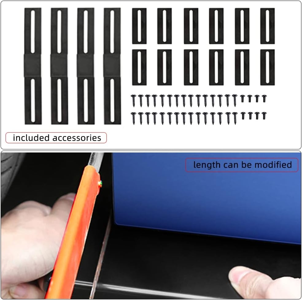 • 🚗 Installation: Use matching bolts for installation(Screws and instruction are included) It requires drilling holes to attach the side skirts safely to the vehicle. It may need to be cut on the ends to suit your vehicle