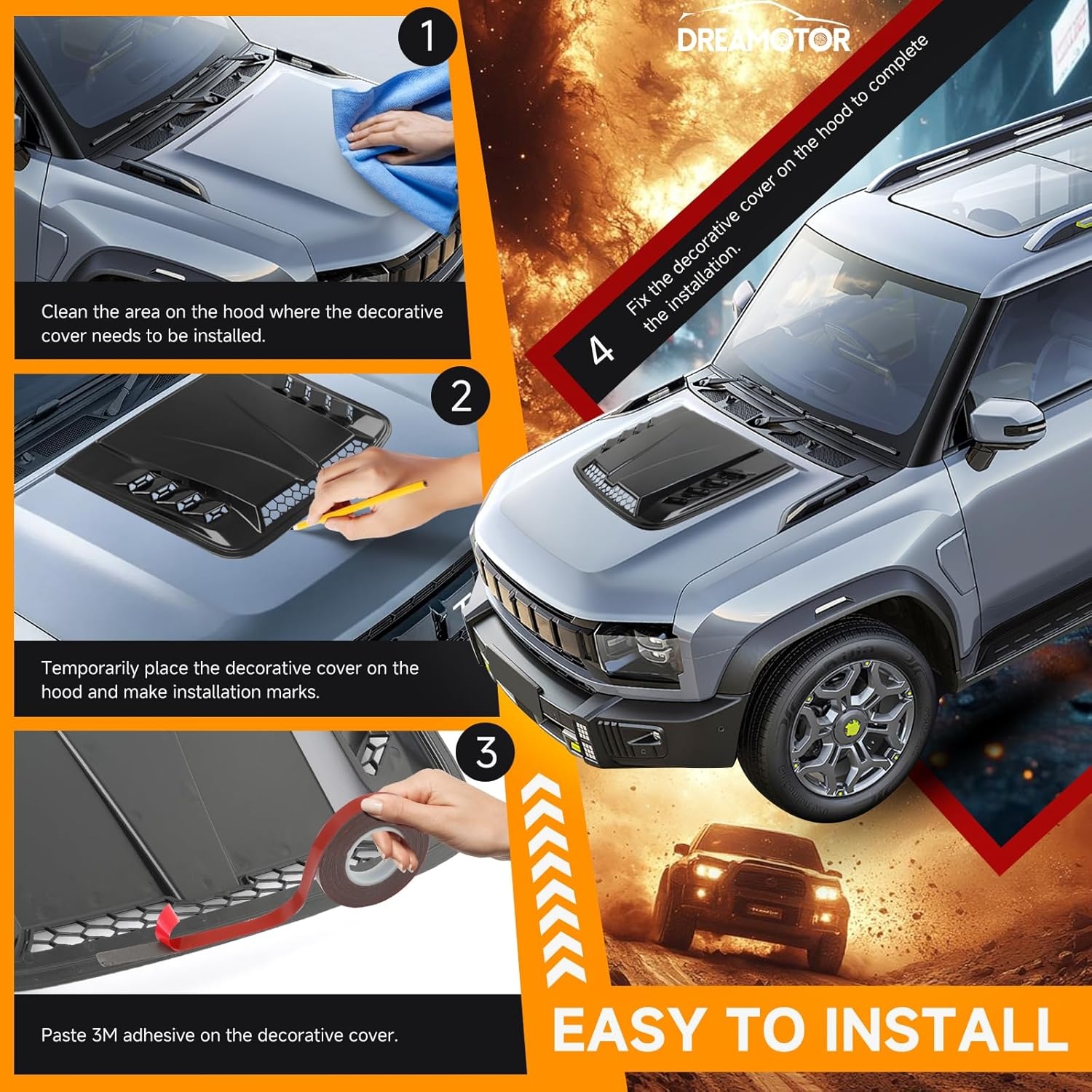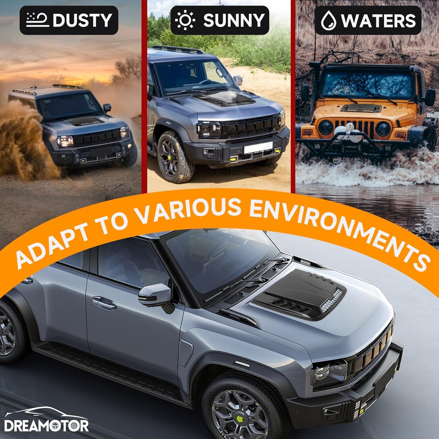 • 𝐄𝐧𝐡𝐚𝐧𝐜𝐞 𝐏𝐞𝐫𝐟𝐨𝐫𝐦𝐚𝐧𝐜𝐞 & 𝐒𝐭𝐲𝐥𝐞 – DREAMOTOR universal hood scoop isn’t just for show—it’s functional! Designed to redirect airflow into the engine bay, it helps reduce heat buildup, improving engine efficiency and preventing overheating during intense drives. Plus, it gives your truck a rugged, custom-made appearance that stands out on the road. Whether you’re off-roading or cruising downtown, it boosts both performance and visual appeal.