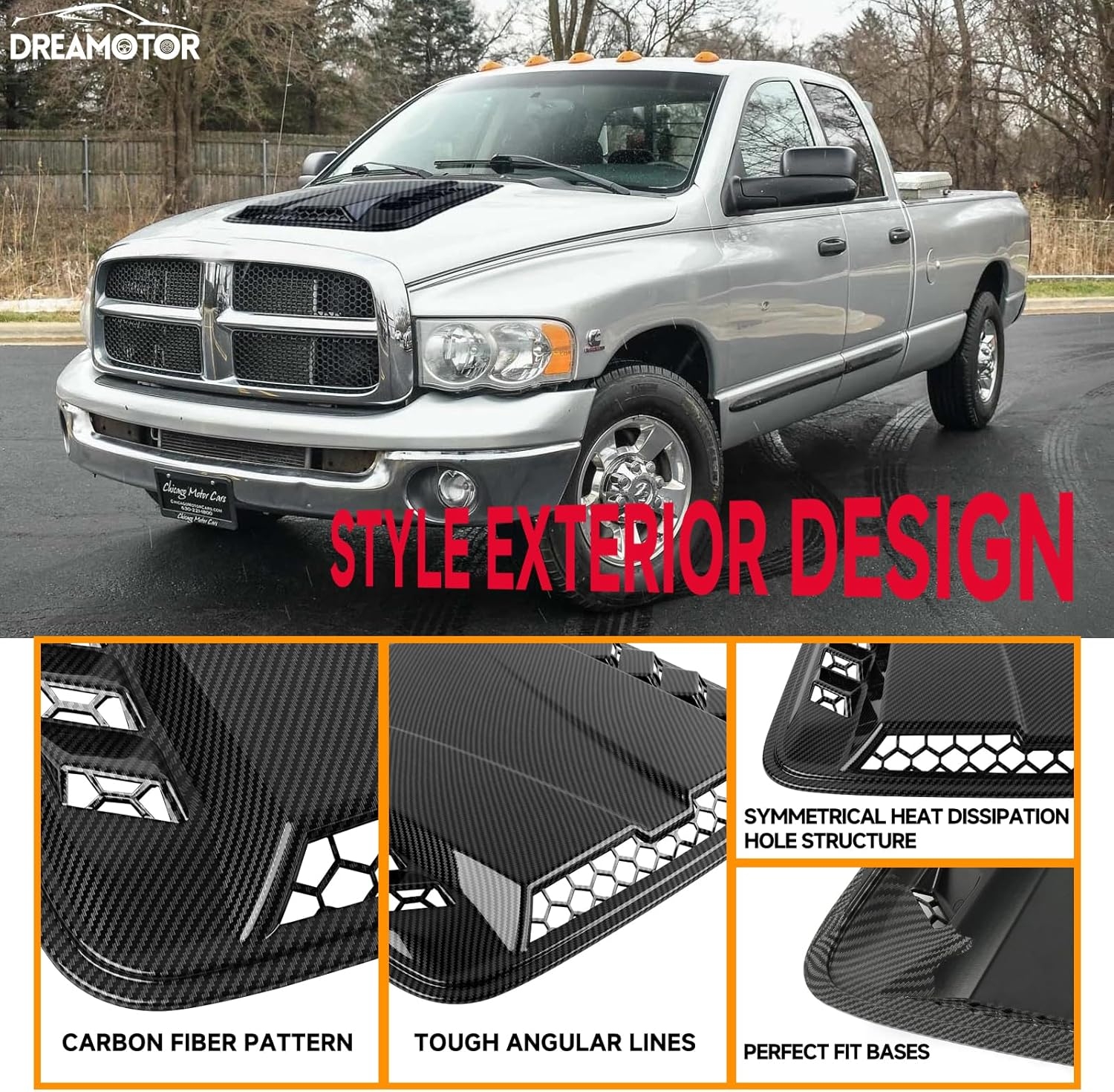 • 𝐏𝐞𝐫𝐟𝐞𝐜𝐭 𝐅𝐢𝐭 – DREAMOTOR hood vents for trucks toma de aire para capo fits models like the Dodge Ram 1500 2500 3500 Ram 1500 2500 3500 Toyota Tacoma 4Runner Tundra GMC Sierra 1500 2500 3500 Nissan Frontier Titan Jeep Wrangler JK JKU JL Grand Cherokee Tahoe Chevy Silverado 1500 Ford Ranger GMC Canyon. and adding this scoop enhances their aggressive style while aiding engine cooling—ideal for towing, off-roading, or daily drives.