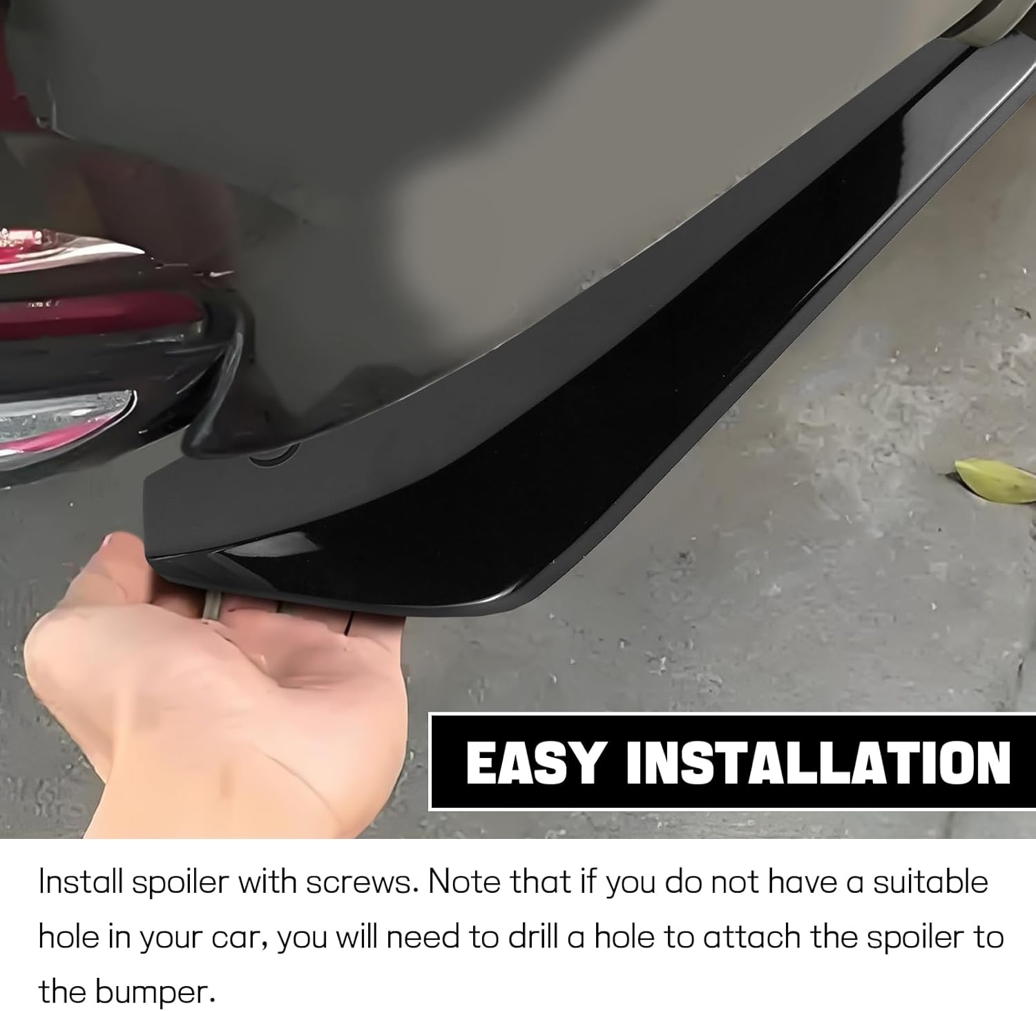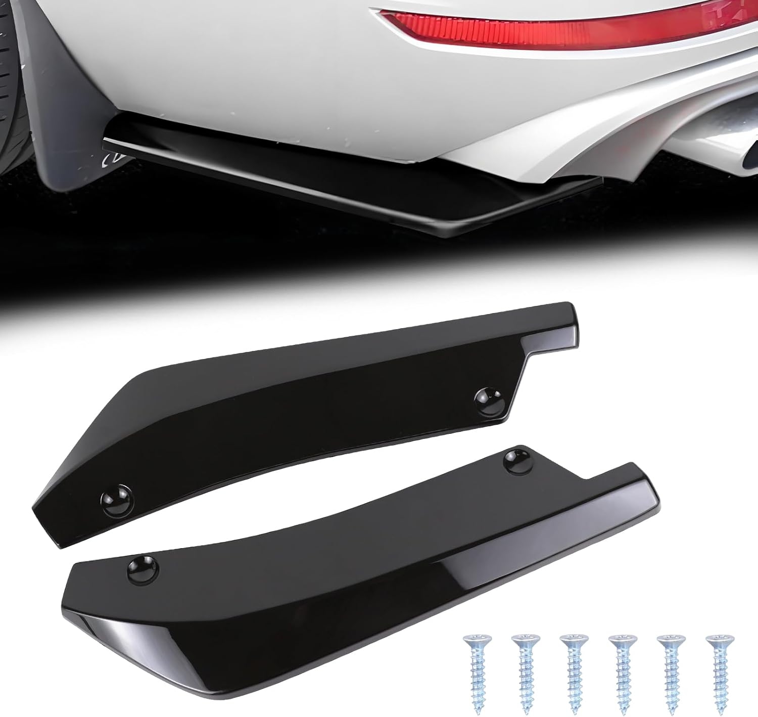 【Package & Installation】: You will receive 2 rear bumper diffuser spoilers with 6 mounting screws included. To install, you need to clean the target location and then install the spoilers with the screws. Please note that if there is no proper hole on your car, you will need to drill holes to mount the spoilers to the bumpers.