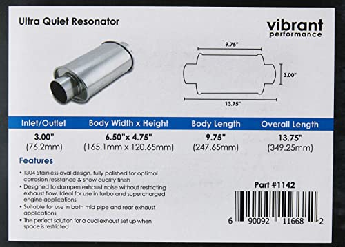 Vibrant 3″ ultra quiet resonator is designed to dampen exhaust noise and facilitate undisrupted exhaust flow. It is constructed from T304 Stainless steel and features a “True Straight Through” perforated core surrounded by sound absorption materials. This highly durable resonator can withstand high exhaust temperature and is Five year limited warranty.