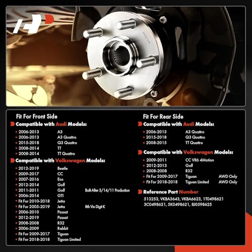 [Specification]: ①Position: Front or Rear Side; ②Speed Sensor Included: No; ③Material: GCr15 Steel and 65Mn Steel; ④Wheel Stud Quantity: Not Applicable; ⑤Flange Type: with 4-Hole Flange; ⑥Axle Splines Type: Insert CV Axle Immediately; ⑦Pre-Greased: Yes; ⑧Reference Part Number: 5K0498621, 1T0498621, 3C0498621, 8J0598625, H513253, 513253, 7800327; ⑨About Warranty: 1-Year