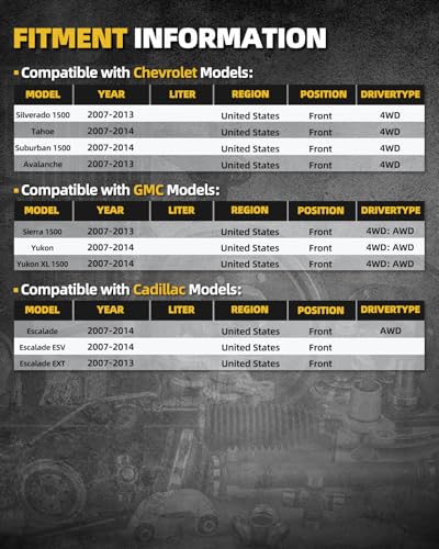 Compatibility Info – Fit for Four Wheel Drive models (4WD / 4×4): for Chevy Silverado 1500 2007-2013, for GMC Sierra 1500 2007-2013, for Chevy Tahoe 2007-2014, for Chevy Suburban 1500 2007-2014, for GMC Yukon 2007-2014, for GMC Yukon XL 1500 2007-2014, for Chevy Avalanche 2007-2013, for Cadillac Escalade 2007-2014, for Cadillac Escalade ESV 2007-2014, for Cadillac Escalade EXT 2007-2013