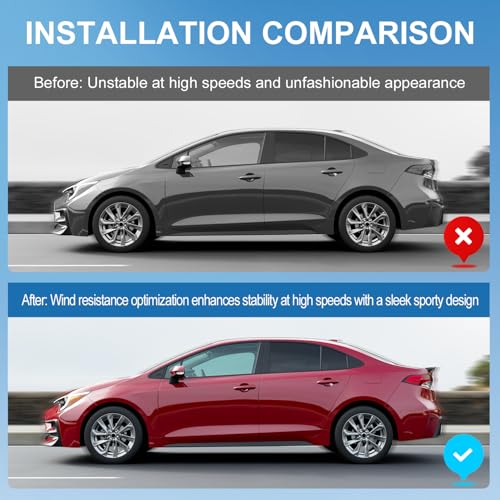 Simple to Install:The trunk wing compatible with 2025 Corolla spoiler is easy to install. They come with a high viscosity double-sided tape on the back, so installation is easy and simple. First, you need to wipe down the mounting locations, then place them in the right place, and finally just press them firmly. If you need, you can use a hair dryer to heat the double sided tape to make it stick stronger. Do not touch water within 48 hours after installation.
